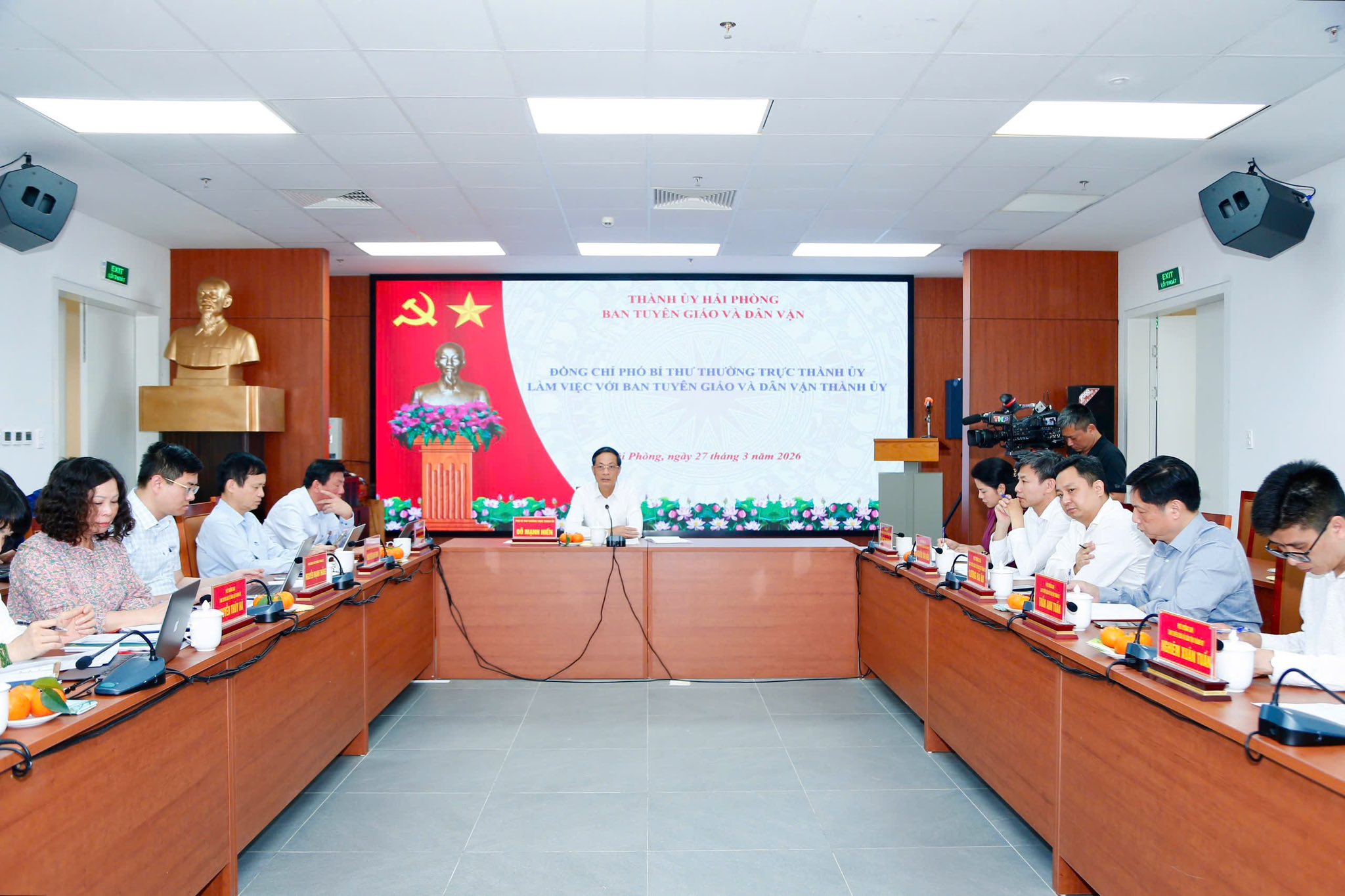 Đồng chí Đỗ Mạnh Hiến, Phó Bí thư Thường trực Thành ủy phát biểu chỉ đạo tại cuộc làm việc.Trong quý I/2026, Ban Tuyên giáo và Dân vận Thành ủy đã chủ động tham mưu, triển khai hiệu quả các nhiệm vụ được giao. Nổi bật là tổ chức quán triệt các nghị quyết Đại hội XIV của Đảng; các Nghị quyết số 79, 80 của Bộ Chính trị; tích cực tham gia chuẩn bị và tổ chức cuộc bầu cử đại biểu Quốc hội khóa XVI và HĐND các cấp nhiệm kỳ 2026–2031. Công tác tham mưu ban hành các văn bản lãnh đạo, chỉ đạo trên lĩnh vực tuyên giáo, dân vận, dân tộc, tôn giáo và hoạt động Ban Chỉ đạo 35 được thực hiện kịp thời; bước đầu triển khai các đề án, nghị quyết về xây dựng chủ nghĩa xã hội gắn với con người xã hội chủ nghĩa trên địa bàn thành phố.