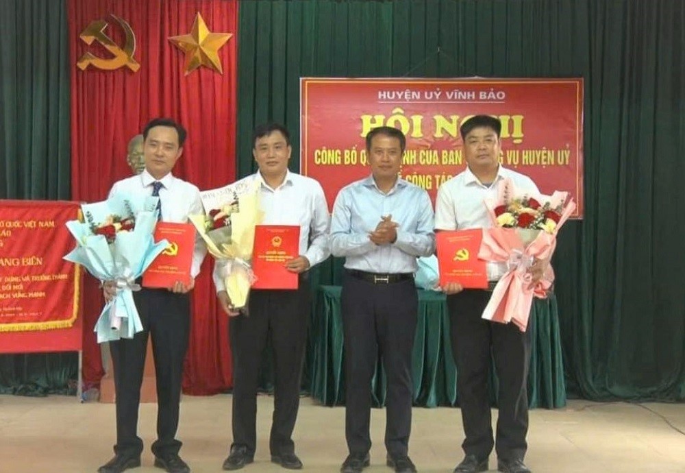 Ngày 1/10/2024, Huyện ủy Vĩnh Bảo thành lập 10 đoàn tới công bố các quyết định của Ban Thường vụ Huyện ủy về công tác cán bộ tại 7 xã, thị trấn và một số phòng, ban trong huyện. Theo đó, trong đợt này, toàn huyện có 37 đồng chí cán bộ cấp huyện, cấp xã được Ban Thường vụ Huyện ủy điều đồng, luân chuyển, bổ nhiệm, chỉ định tham gia Ban chấp hành, Ban Thường vụ, chỉ định giữ chức vụ Bí thư Đảng ủy, Phó Bí thư Đảng ủy cấp xã nhiệm kỳ 2020-2025.