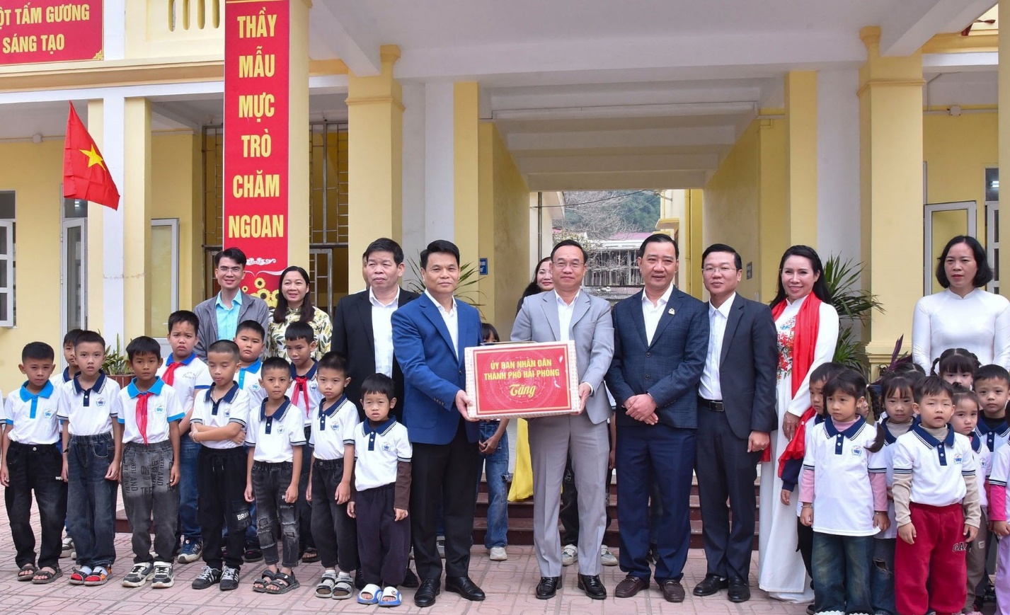 Đồng chí Lê Ngọc Châu, Phó Bí thư Thành uỷ, Chủ tịch Ủy ban nhân dân thành phố thăm, tặng quà thầy và trò Trường Tiểu học - Mẫu giáo đặc khu Bạch Long Vĩ.